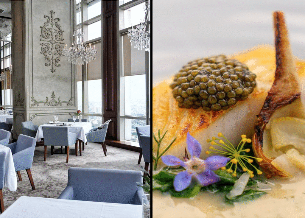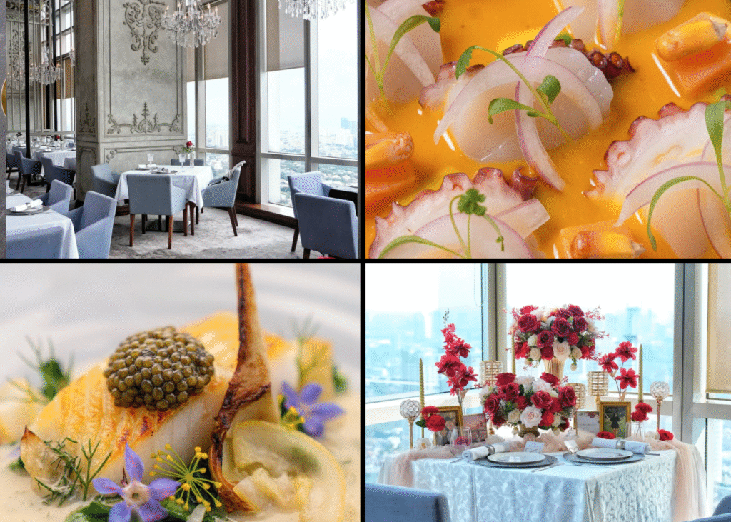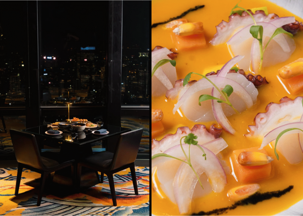 Henshin memukau dengan hidangan andalannya, yaitu Nikkei Cuisine (Rp 2.190.000 untuk 8 course menu)—perpaduan berani antara masakan Peru dan teknik memasak Jepang, menawarkan sushi/sashimi yang unik dan hidangan a la carte eksklusif. Terletak di lantai tertinggi, Henshin menyuguhkan pemandangan panorama 360 derajat skyline Jakarta yang menakjubkan, terutama dari Bar & Lounge di Level 67. Vibe-nya adalah dinamis, chic, dan modern, dengan pencahayaan warna-warni dan arsitektur kaca yang mencolok, sangat cocok untuk pasangan yang mencari sensasi kemewahan rooftop yang spektakuler dan memorable.